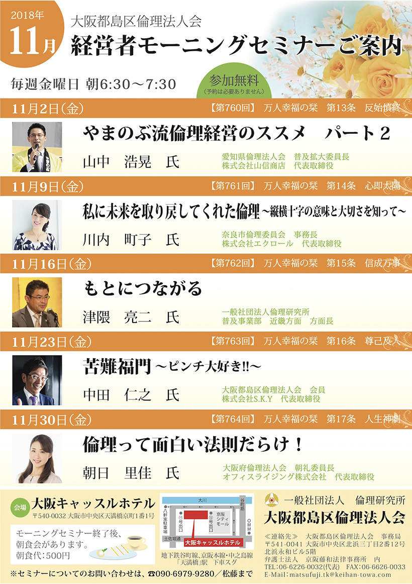 【大阪都島区】11月のセミナー情報【モーニングセミナー】 投稿日 2018年10月30日 カテゴリー NEWS 大阪都島区倫理法人会による経営者モーニングセミナーが大阪キャッスルホテルにて開催されます。 やまのぶ流倫理経営のススメ パート1 私に未来を取り戻してくれた倫理~縦横十字の意味と大切さを知って~ もとにつながる 苦難福門~ピンチ大好き!!~ 倫理って面白い法則だらけ!