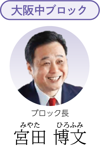中ブロック長を拝命いたします、株式会社宮田運輸代表取締役会長宮田博文です。中ブロックは個性的で強烈なリーダーシップを持つ中1地区の屋鋪地区長と中2地区の藤原地区長が地区の独自性と大きな愛を持つ実直な6単会会長が愛の共働態となり、関係性の質を上げて大阪一の倫理共働態を目指して参ります。そして各単会の皆様が倫理に繋がり自分が変わり家庭に安らぎを創り職場に笑顔が広がり社会に貢献する実践の場を共有することで美しい日本の未来を共創する仲間を一人でも多くつくって参ります。全ては「愛でいけるやん」を信じ自己肯定他者肯定の精神で明朗に率先垂範して参ります。1年間皆様どうかよろしくお願い申し上げます。