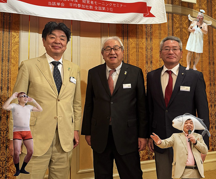 お待たせしました、こちらが堺市倫理法人会名物「サンバイザー」でございます。堺市、そして大阪府を牽引してきたトップリーダーでありながら、会を盛り上げるためなら一肌脱ぐことも厭わないお茶目な御三方。