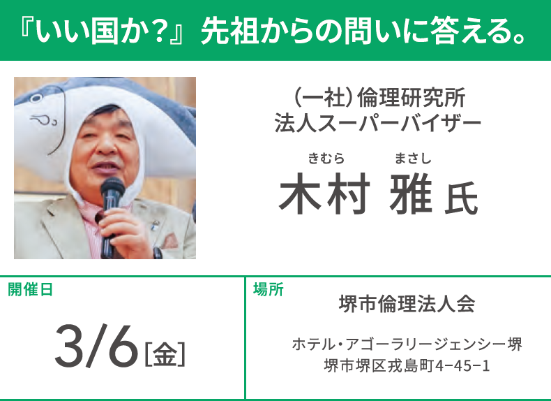 創設25周年を目前に、日本一をめざして爆進中の堺市倫理法人会1200回記念モーニングセミナーは、第6代会長としてその隆盛を創り出した木村雅法人スーパーバイザーが登壇。長男のことで倫理指導を受けた体験談を通じ、職場・家庭・地域など良き共同体を作り、先祖に誇れる国を作るリーダーの「使命」について熱く語ります。何のために学び、生きるのか。自分の使命は何なのか。人間の本質に触れる気づきの多い朝になること間違いなし!もうサンバイザーだなんて軽々しく呼べなくなる可能性大!来たれ、日本一熱いモーニングセミナー!!