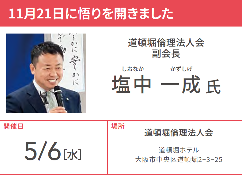 天文学や心理学、帝王学など、24年にわたり「悟り」を求めて多角的な探究を続けてきた塩中さん。倫理法人会での15年の歩みを経て、昨年11月21日、ついにその境地に到達しました。