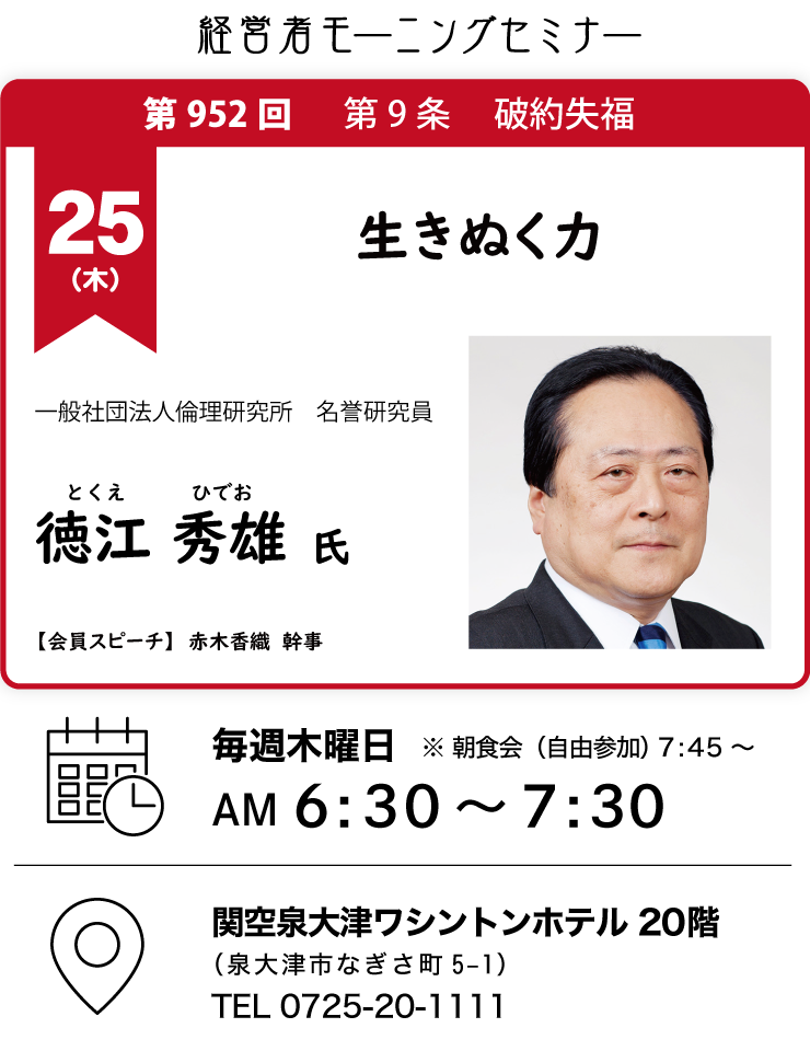 2024 01/ 25 木 06:30-07:30 参加費:無料 泉州倫理法人会 モーニングセミナー 終了しました 生きぬく力 講話者 一般社団法人倫理研究所 名誉研究員 徳江 秀雄氏 セミナー参加申込 会場 関空泉大津ワシントンホテル 泉大津市なぎさ町5-1 20F 主催 泉州倫理法人会 + iCal エクスポート スケジュール一覧へ戻る