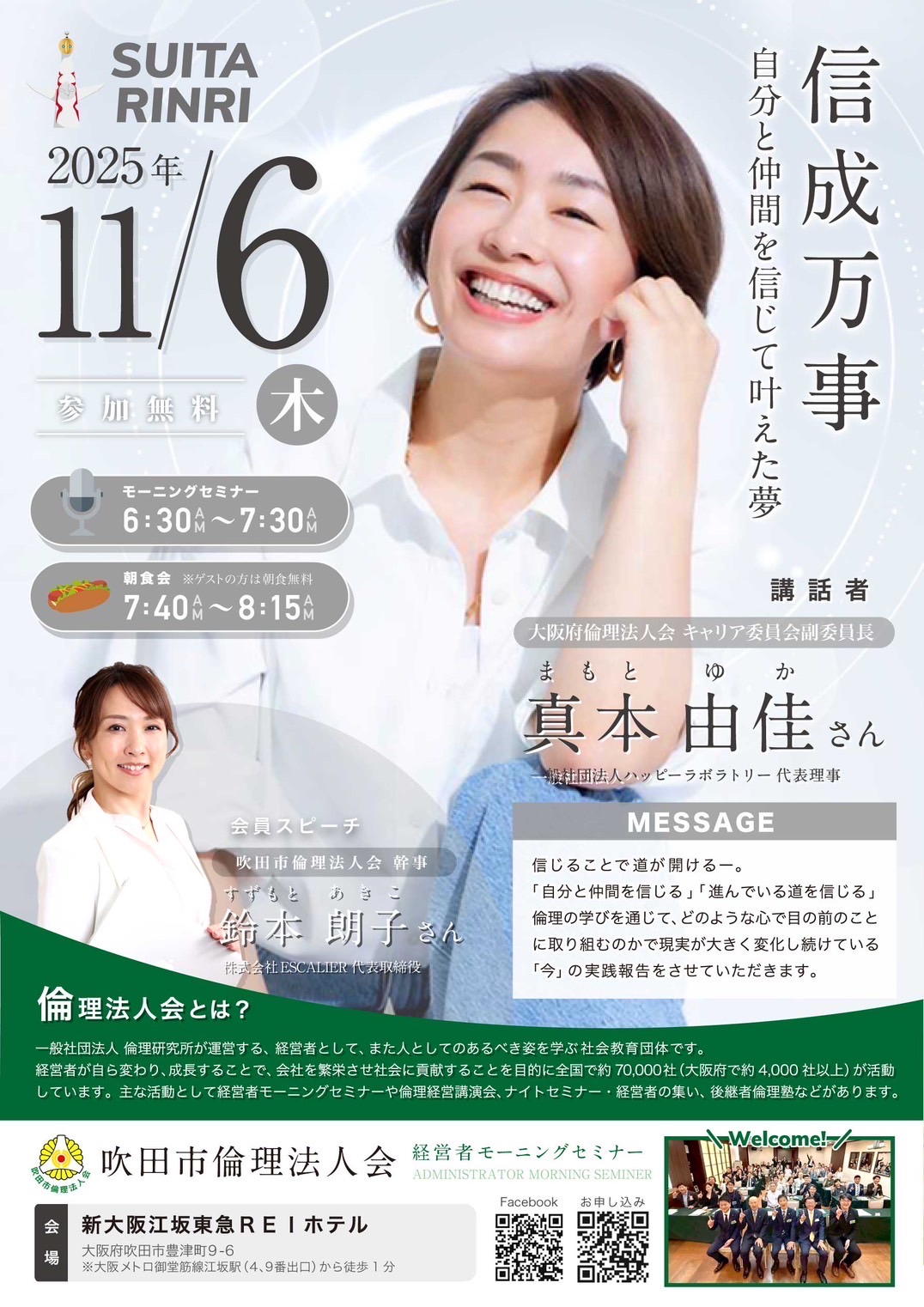 2025 11/ 06 木 06:30-07:30 参加費:無料 吹田市倫理法人会 モーニングセミナー 信成万事 ~自分と仲間を信じて叶えた夢~ 講話者 (一社)ハッピーラボラトリー 代表理事 大阪府倫理法人会 キャリア委員会 副委員長 真本 由佳氏 会員スピーチ (株)ESCALIER 代表取締役 吹田市倫理法人会 幹事 鈴本 朗子氏 セミナー参加申込 会場 新大阪江坂東急REIホテル 吹田市豊津町9-6 主催 吹田市倫理法人会 + iCal エクスポート スケジュール一覧へ戻る