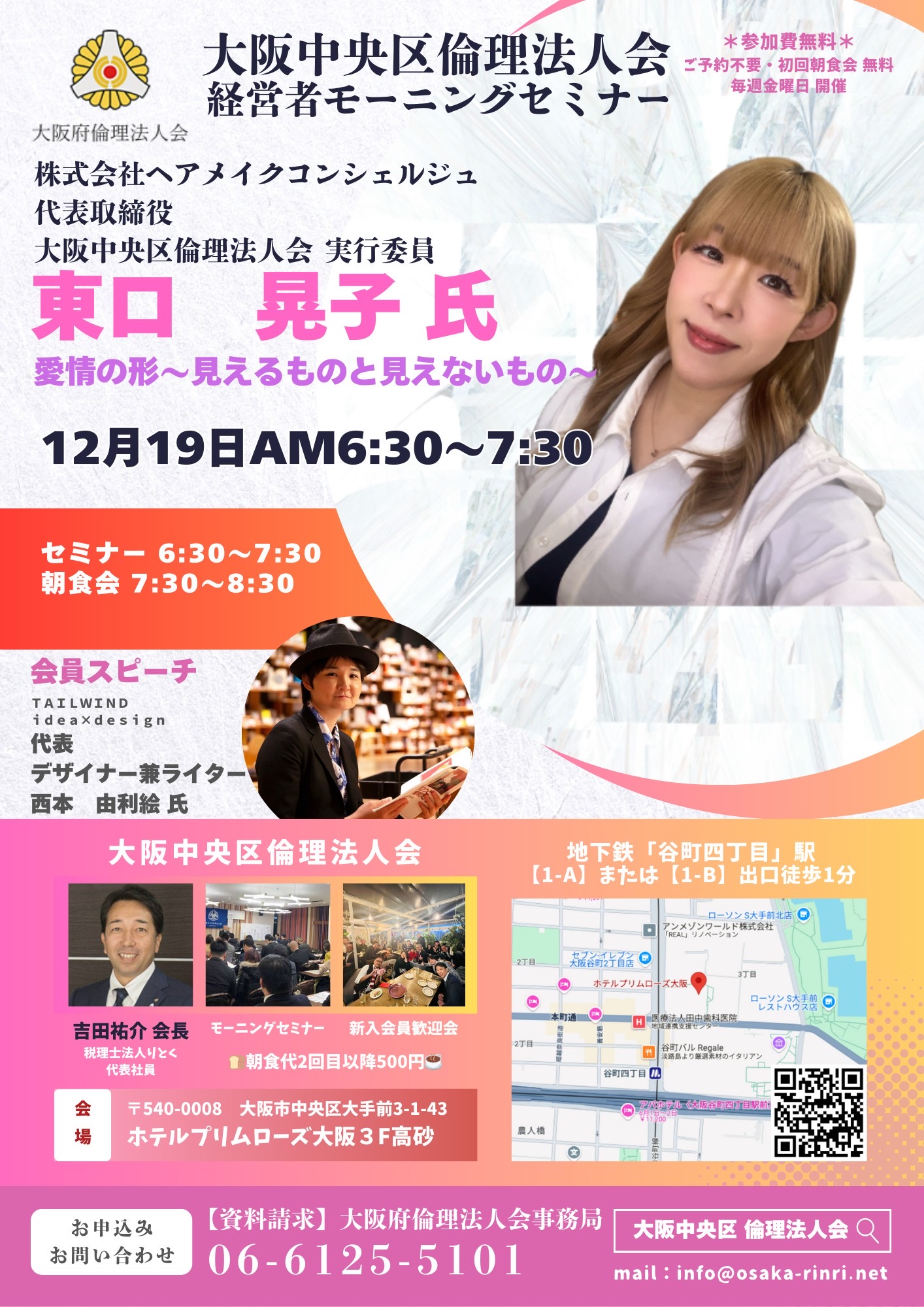 2025 12/ 19 金 06:30-07:30 参加費:無料 大阪中央区倫理法人会 モーニングセミナー 愛情の形〜見えるものと見えないもの〜 講話者 株式会社ヘアメイクコンシェルジュ 代表取締役 大阪中央区倫理法人会 実行委員 東口 晃子氏 会員スピーチ TAILWIND idea×design 代表デザイナー兼ライター 大阪府倫理法人会 経営者育成委員会 副委員長 西本 由利絵氏 セミナー参加申込 会場 ホテルプリムローズ大阪 〒540-0008 大阪府大阪市中央区大手前3丁目1−43 主催 大阪中央区倫理法人会 + iCal エクスポート スケジュール一覧へ戻る